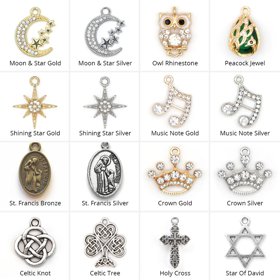 ►Anchor (Gold/Silver) (19 x 19 mm) ►Celtic Knot (23 x 19 mm) ►Celtic Tree (23 x 19 mm) ►Crown Gold (25 x 22 mm) ►Crown Gold (25 x 22 mm) ►Crystal Flower Green (15 x 21 mm) ►Crystal Flower Pink (15 x 21 mm) ►Crystal Flower Red (15 x 21 mm) ►Crystal Heart Clear (18 x 16 mm) ►Crystal Heart Lt Green (18 x 16 mm) ►Crystal Heart Ocean (18 x 16 mm) ►Crystal Heart Orange (18 x 16 mm) ►Crystal Heart Pink (18 x 16 mm) ►Crystal Heart Red (18 x 16 mm) ►Crystal Heart Sapphire (18 x 16 mm) ►Double Heart Purple (20 x 20 mm) ►Double Heart Red (20 x 20 mm) ►Evil Eye (17 x 14 mm) ►Flower Silver (21 x 24 mm) ►Glitter Heart Blue (16 x 17 mm) ►Glitter Heart Pink (16 x 17 mm) ►Glitter Heart Purple (16 x 17 mm) ►Glitter Heart Red (16 x 17 mm) ►Heart Iridescent Blue (21 x 18mm) ►Heart Iridescent Pink (21 x 18mm) ►Heart Scales Black (13 x 16 mm) ►Heart Scales Green (13 x 16 mm) ►Heart Scales Pink (13 x 16 mm) ►Heart Scales Purple (13 x 16 mm) ►Holy Cross (27 x 17 mm) ►Horseshoe Gold (12 x 16 mm) ►Lightning Gold (10 x 25 mm) ►Moon & Star - Gold (16 x 19 mm) ►Moon & Star - Silver (16 x 19 mm) ►Music Note Gold (18 x 23 mm) ►Music Note Silver (18 x 23 mm) ►Owl Rhinestone (14 x 20mm) ►Peace Sign (17 x 21 mm) ►Peacock Jewel (13 x 20 mm) ►Pearl (14 x 22 mm) ►Ribbon Gold - (16 x 17 mm) ►Ribbon Pink - (25 x 19 mm) ►Shining Star Gold/Silver (25 x 21 mm) ►Star Gem Purple (15 x 13 mm) ►Star Mini (13 x 15 mm) ►Star of David (21 x 16 mm) ►Star Outline (21 x 23 mm) ►Star Pave Mini (14 x 16 mm) ►St. Francis Bronze/Silver (26 x 16 mm) ►Sun Rays (24 x 27 mm)